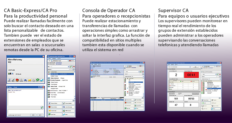 La suite de comunicación unificada «Communication Assistant» de Panasonic es un conjunto de aplicaciones altamente intuitivas para PC, que incluye un potente sistema de telefonía «point and click» presencia y disponibilidad, integración con Microsoft Outlook®, mensajería de voz y una gran variedad de herramientas de colaboración en pantalla. para simplificar la comunicación en tiempo real