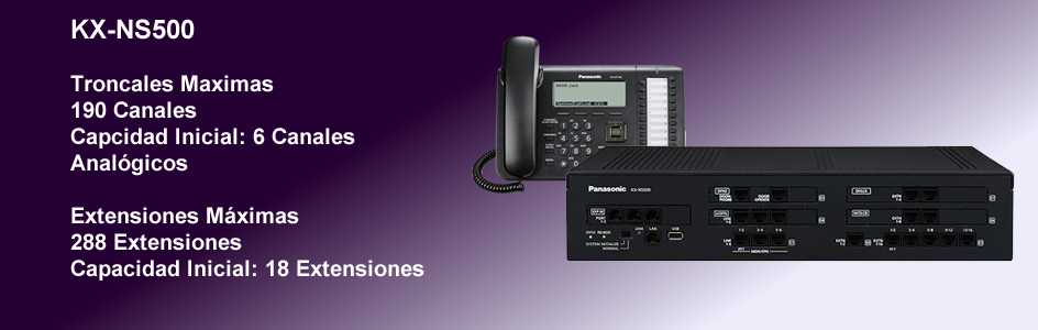 El conmutador IP KX-NS500 incluye funciones avanzadas a partir de seis conexiones troncales analógicas y 18 extensiones, con capacidad de ampliación hasta 190 canales y 288 extensiones mediante la agregación de unidades de expansión. Esta solución ofrece además un sistema de comunicaciones unificadas con numerosas funciones IP, como enlace móvil, correo de voz y correo electrónico integrados, mensajería instantánea (chat) e información de presencia.